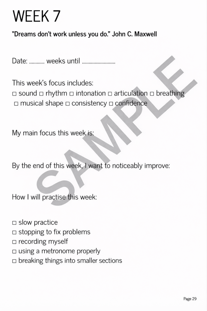 A structured weekly journal designed to help musicians practise with clarity and purpose. Full of inspirational quotes, each page guides students to set meaningful goals, reflect on progress, and develop consistent practice habits. Ideal for intermediate to advanced students preparing for exams, performances, or tertiary study. This is a digital download ideal for working on your iPad or for printing at home. A link is provided at check out.